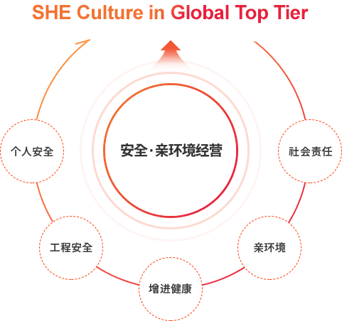 展望 SHE Culture in Global Top Tier 目标 安全·亲环境经营 战略 个人安全、工程安全、增进健康、亲环境、社会责任 基本原则(6E) Engineering Equipment Education Enforcement Evaluation Emotion